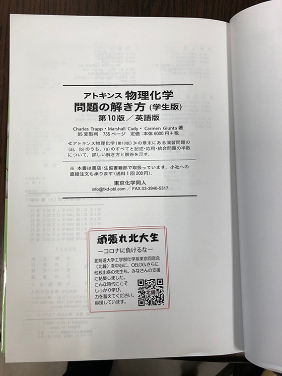 この募金の使い途に関して北大の先生方を交えてGW前に議論をして第1弾の2年生への物理化学の教科書の贈呈(4月8日に贈呈済み)に続く、第2弾の支援について決定しました。
